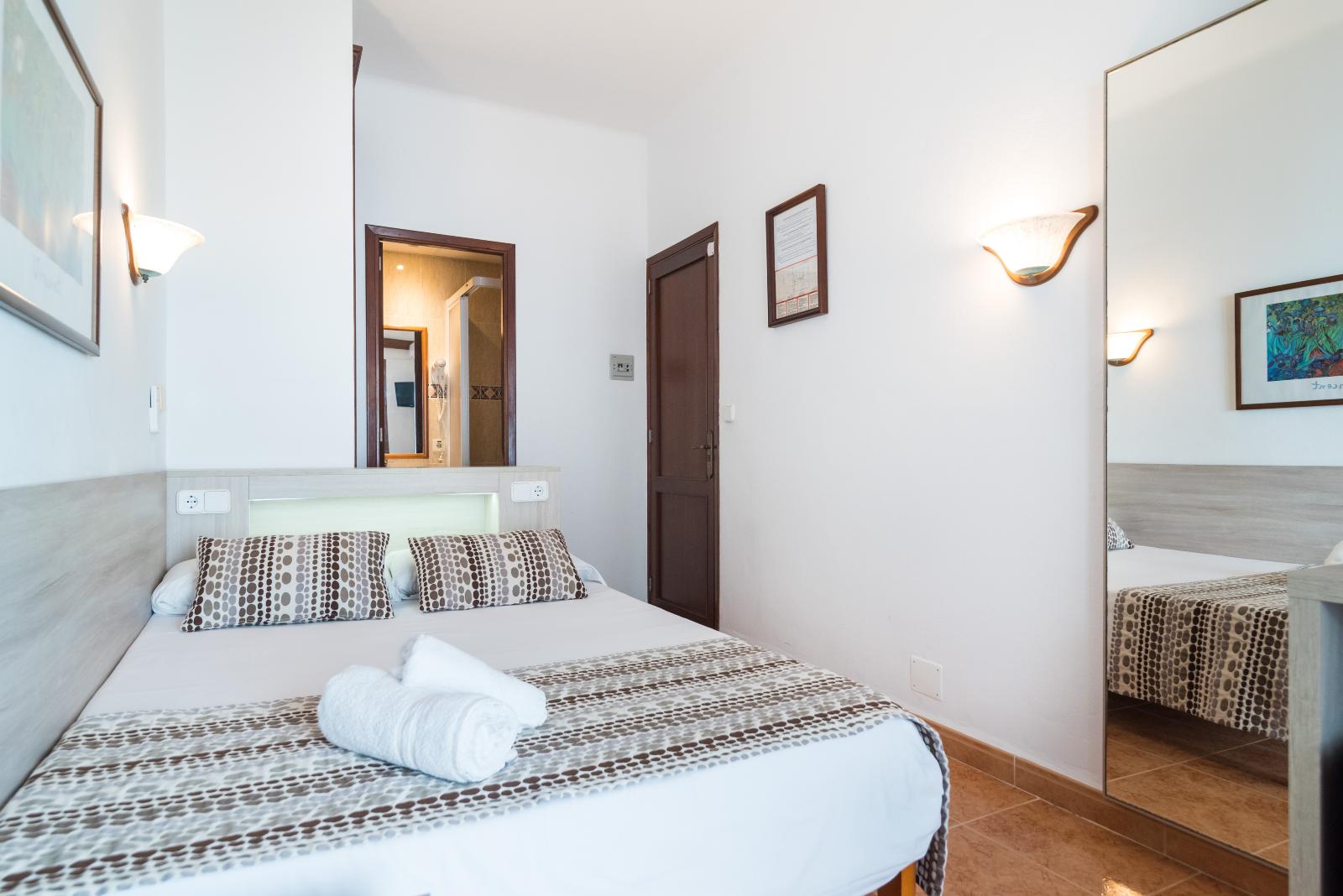 The single rooms at Hotel Ses Puntetes provide everything needed for a perfect stay in Cala d'Or, Mallorca. Bright and cozy in design, they feature tiled floors, a single bed, air conditioning, heating, free Wi-Fi, a TV, a mini fridge, and a spacious balcony with street views. The private bathroom includes a shower, toiletries, a hairdryer, towels, bed linens, and pillows. These 10 m² rooms are ideal for one guest only. Smoke-free spaces ensure a peaceful and relaxing experience.